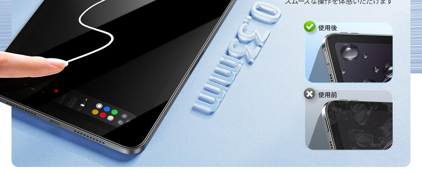 - 【優れた操作性 】超極薄デザイン、かつフィルム表面に高耐久撥油コーティングが施されたことで、指紋や汚れが付きにくくになりますし、iPad画面の精細さも損ないません。画面上の操作も違和感なくスムーズに行えます。