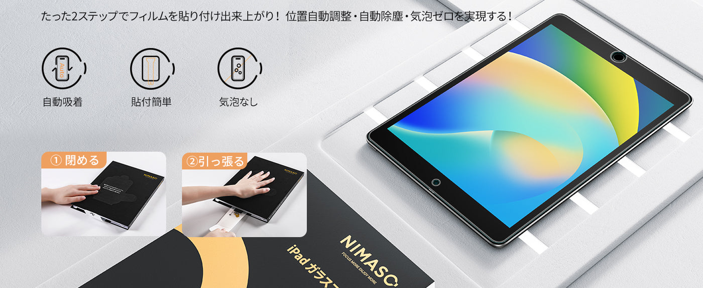 ♥誰でも簡単に貼れる:NIMASO最新デザインの自動除塵セットは、他の補助工具を必要とせず、引っ張るだけで貼り付けが完了します。自動除塵セットには正確な位置決め装置が搭載されており、iPad 10.2の画面にぴったり合うようにフィルムが配置されています。これにより、貼り付け時に自動的に位置調整が可能になり、効率的で精度のよい貼り付けが可能になりました。フィルムを貼るのが苦手な方でも簡単にフィルムが貼ることができます、「誰でも簡単に貼れる」を実現します。