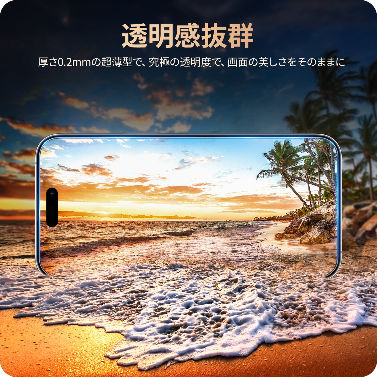 • 【超薄型・割れない】新世代の基材により、普通のガラスフィルムより薄い、わずか0.2mmの薄さ。高透過率光学材料を採用しており、光学性能は従来の光学ガラスより優れて、スマホ本体の画面を損ないません。まるでフィルムを貼っていないかのような素晴らしい手触りです。高い強度で強くて割れなくて、最後まで大切なスマホを守ります。