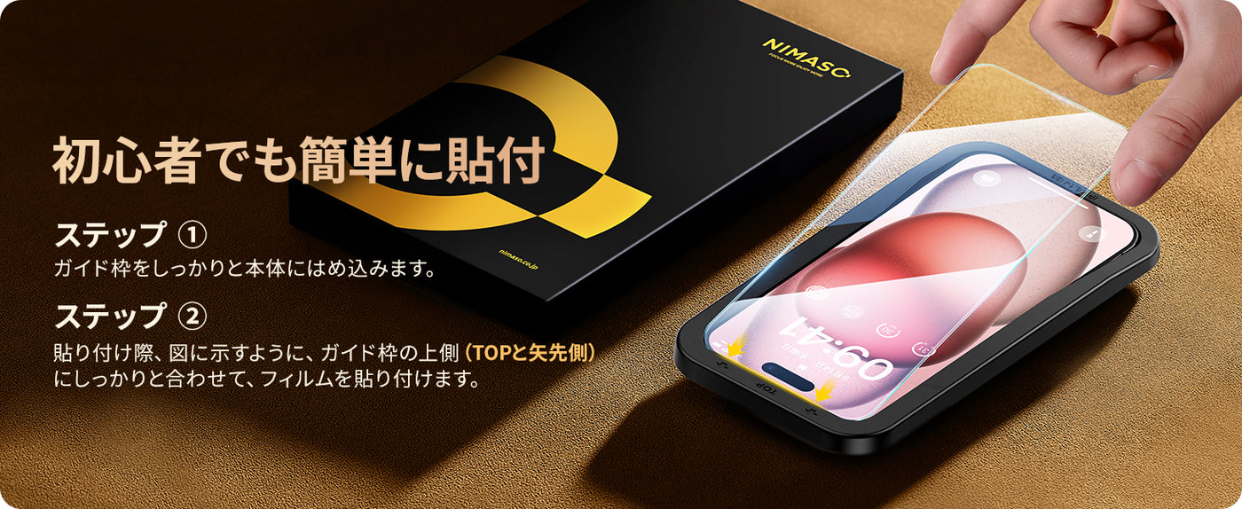 • 【たったの3ステップ・初心者でも綺麗に貼れる】ガイド枠をはめる→上側に合わせて、フィルムを置く→軽く押すだけで自然に吸着。初めての方でも簡単に貼り付けられるよう、専用の貼り付けガイド枠を同梱しています。スマートフォンと保護フイルムがズレることなく、だれでも簡単にフィルムを貼ることができます。