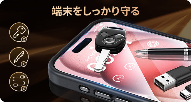 • 【米軍規格・傷や衝撃に強い】米軍規格「MIL-STD-810H」に準拠(認証番号:SZXEC23002005001)・9H表面硬度ガラスを採用しています。スマートフォンがカバンの中で、鍵などの鋭いものにぶつかっても傷が付きにくく、スマートフォンの画面をしっかり保護します。飛散防止加工により、万一割れてもガラス破片が飛び散ることなく安心です。