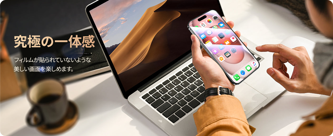 高透過率を持つ極薄ガラスフィルムに高耐久撥油コーティングが施され、画面の精細さを保ち、指紋や汚れが付きにくくなります。美しい画面と滑るような指さわりのスムーズな操作を体感いただけます。
