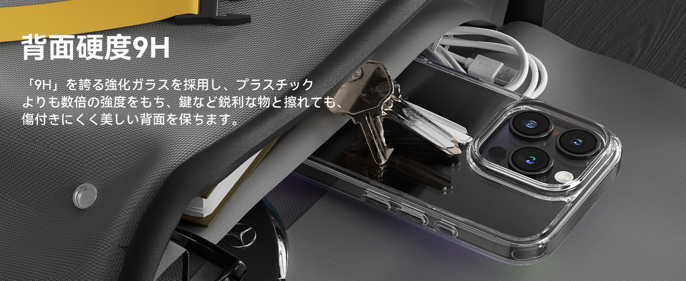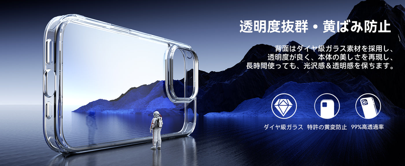 • 【2024最新改良・黄変防止強化】本製品の背面素材はガラスで、その特性により黄ばみが起こりません。さらに、AF防指紋コーティングを施しているため、指紋や汚れがつきにくく、サッと拭くだけで簡単にきれいになります。ケースを使いやすく、清潔に保つことができます。また側面には、ドイツ製バイエルTPU素材を採用し、TPUポリマーにUV剤を添加して黄変防止性能を高めています。長時間使用しても、光沢と透明感を維持します。