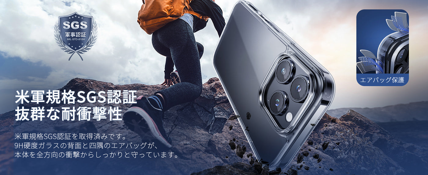 • 【米軍規格SGS認証・超強耐衝撃性】世界で有名な米国防総省が規定する米軍採用品規格「MIL-STD-810H」認証を取得済みです(認証番号:GZMR220802496901-1)。ガラス背面は、9Hの硬度を持ち、鍵など鋭利な物と擦れても傷付きにくく、衝撃からiPhoneを守ります。さらに、側面にはドイツ製の耐衝撃素材TPUを採用し、四隅にはエアバッグを付けて、本体が落下しても衝撃を和らげしっかり守ります。