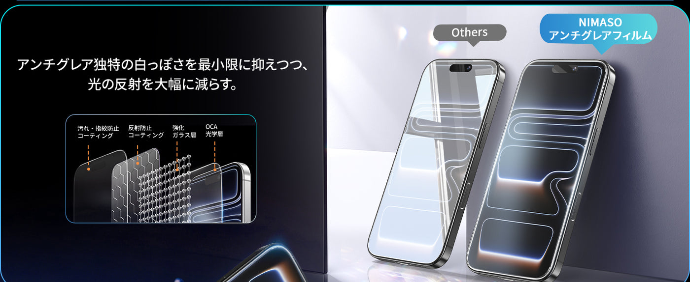 - 【反射低減・視認性向上】 NIMASO独自の反射防止コーティングを施し、太陽光や室内照明の画面への映り込み・反射を効果的に抑制。画面の視認性を高め、長時間の使用でも目の疲労を軽減し、目を保護します。