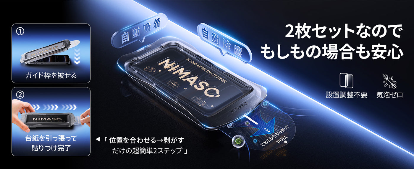 - 【簡単貼付け・自動除塵】NIMASO最新型の自動除塵ガイド枠付き!ガイド枠を装着し、リリースフィルムを引くだけの2ステップで、初めての方でも簡単・確実に貼付け可能。静電気を利用した自動除塵機能で貼り付け時のホコリを除去し、気泡の発生を大幅に抑制。完璧な貼り付けをサポートします。