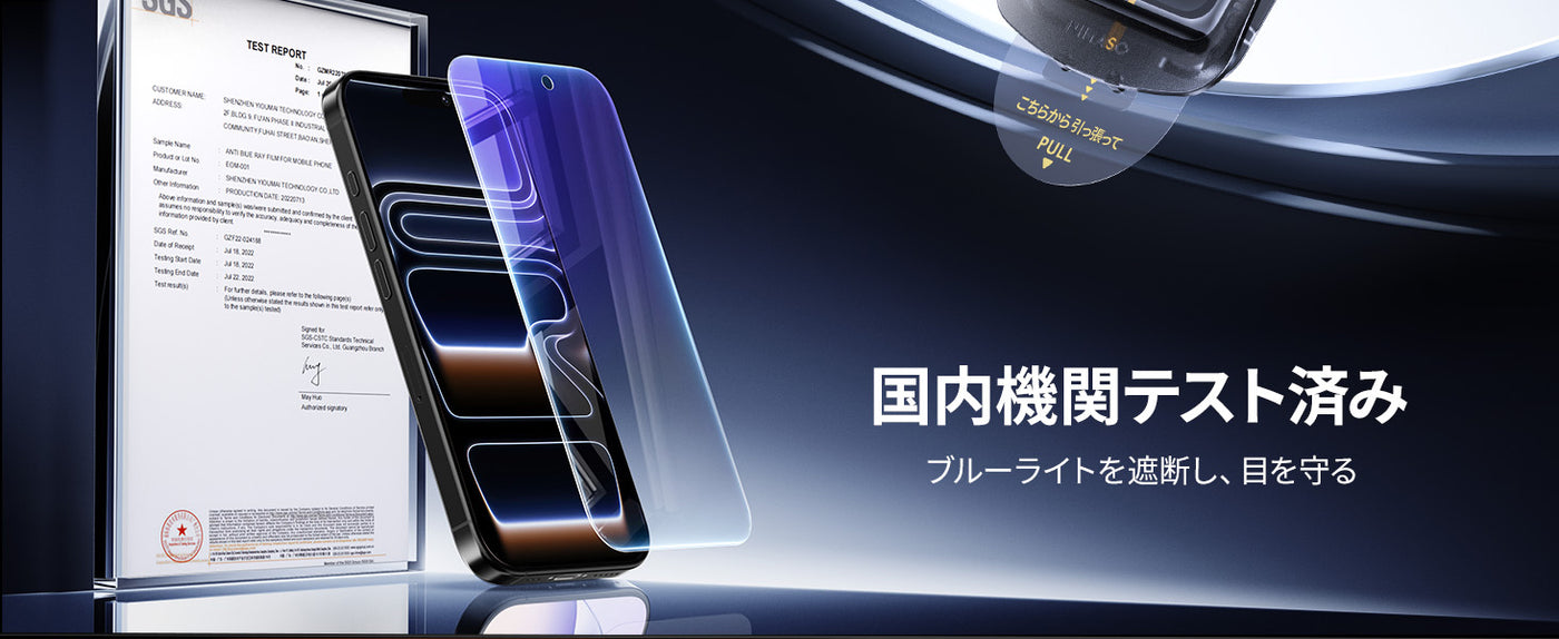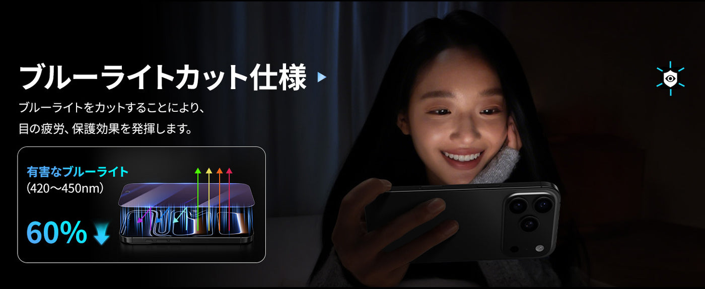 - 【ブルーライトカット・目の疲れ軽減】ブルーライト反射技術によりブルーライトを大幅にカットすることで、目の疲れを軽減します。長時間スマートフォンの画面を見たり、ゲームをしたりする方におススメです。(ご注意:ブルーライトカットの加工で、使用角度や環境によって、淡い黄色や薄い紫色に見える場合がありますので予めご了承下さい。)