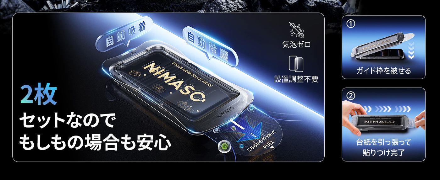 - 【2ステップでOK・自動除塵】NIMASO新型の自動除塵ガイド枠が登場!被せる、引っ張る、たった2ステップで初めての方でも簡単に貼り付けられます。いPhone17 保護フィルムが自然と吸着する構造になっており、静電気を利用して液晶画面の埃を除去します。フィルムの接着面が空気を逃がす構造となっているため、初めての方でも簡単に気泡や埃が入らず完璧な仕上がりにできます。貼付け時の失敗が大幅に軽減できることが特長です。