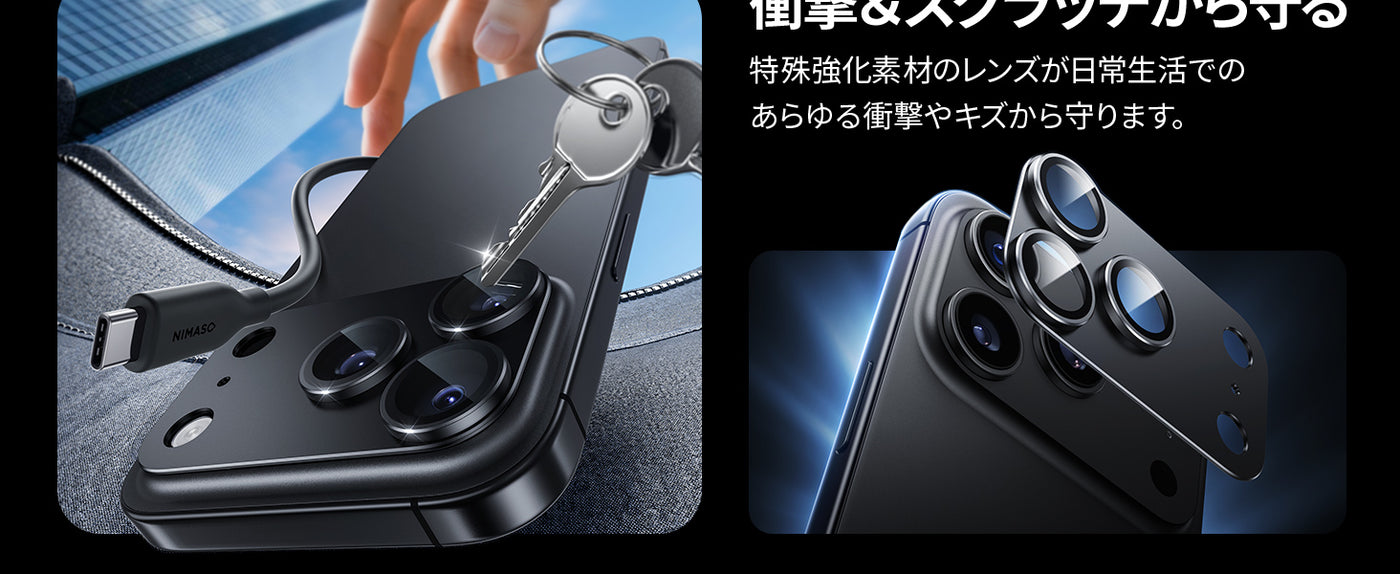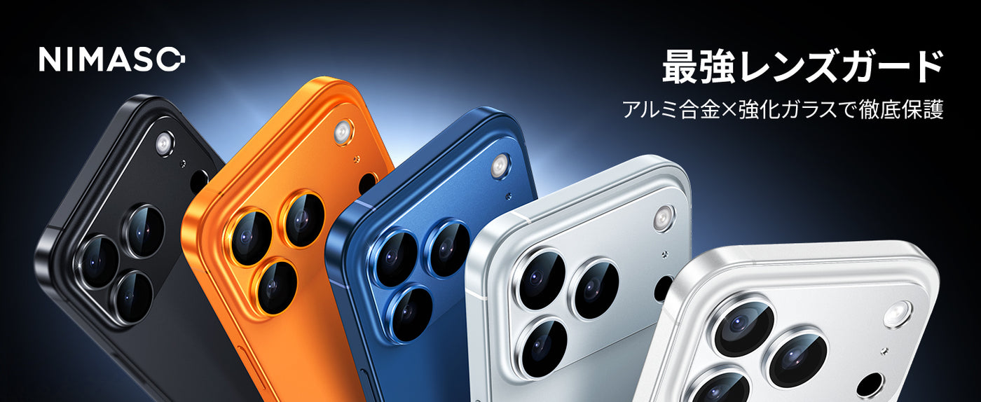 NIMASO iPhone 17/17 Pro/Pro Max/Air用 カメラフィルム アルミ合金+9H強化ガラス 全面保護 黒縁取り 耐衝撃 ガイド枠付き
