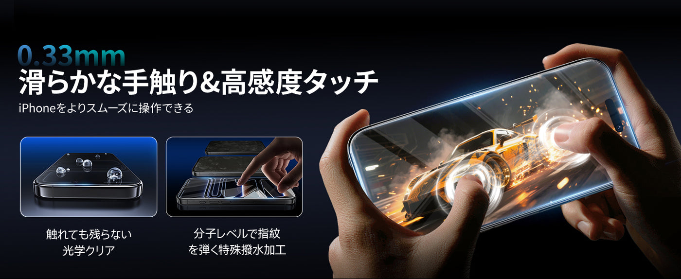 - 【指紋防止・滑らかな触り心地】本製品は撥水撥油のAF(Anti-Fingerprint)コーティング加工とスムースタッチ加工により、指紋や汚れがつきにくく、油分や水分が強く付着した汚れや指紋がついても、拭き取るだけで綺麗になります。また、手触りも滑らかで、毎日の動画視聴や仕事、勉強、ゲームなどのあらゆるシーンでも、常に美しいアイホン17の画面をお楽しみいただけます。