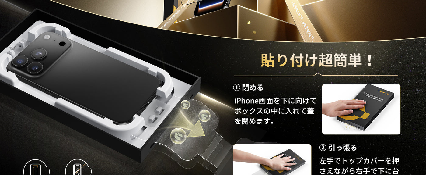 - 【驚くほど簡単!2ステップでズレなし貼り付け】NIMASO最新デザインのバリ楽Boxさえあれば、簡単に貼り付けができます。バリ楽Boxには正確な位置決め装置が搭載されており、アイフォン17の画面にぴったり合うようにフィルムが配置されています。これにより、いPhone17のスクリーンを下に向けた状態でボックス中に入れて引っ張るだけで、誰でも簡単に、位置ズレなく完璧にフィルムを装着できます。