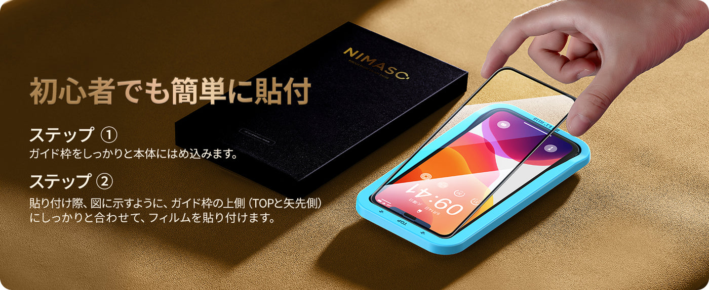 - 【専用貼り付けガイド枠付き】専用の貼り付けガイド枠が同梱されています。ガイド枠を利用することで、本体とフィルムがズレることなく、だれでも簡単にフィルムを貼ることが可能です。また、フィルムのシリコン自己吸着層により、位置を合わせて上から軽く置くだけで気泡が入ることなく簡単に装着できます。 (※万が一失敗しても貼り直しが可能です。)
