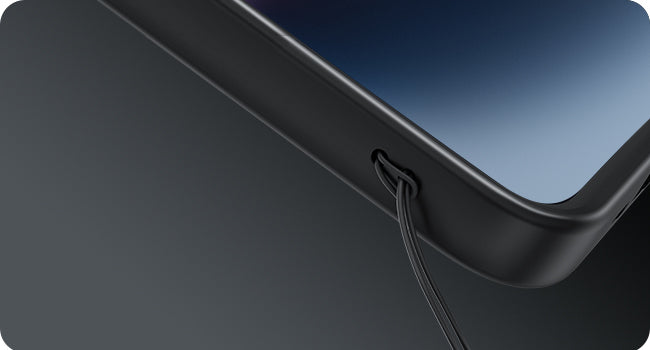 左下にはストラップホールがあり、お好きなストラップを付けられます。細い紐をストラップ紐の先に巻き付け、細い紐をストラップホールに通して完了です。