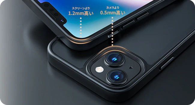 液晶画面より1.2mm高め、併用のガラスフィルムまでも保護できます。背面側はカメラレンズより0.5mm高め、机などの平面に置いても傷付く心配はありません。