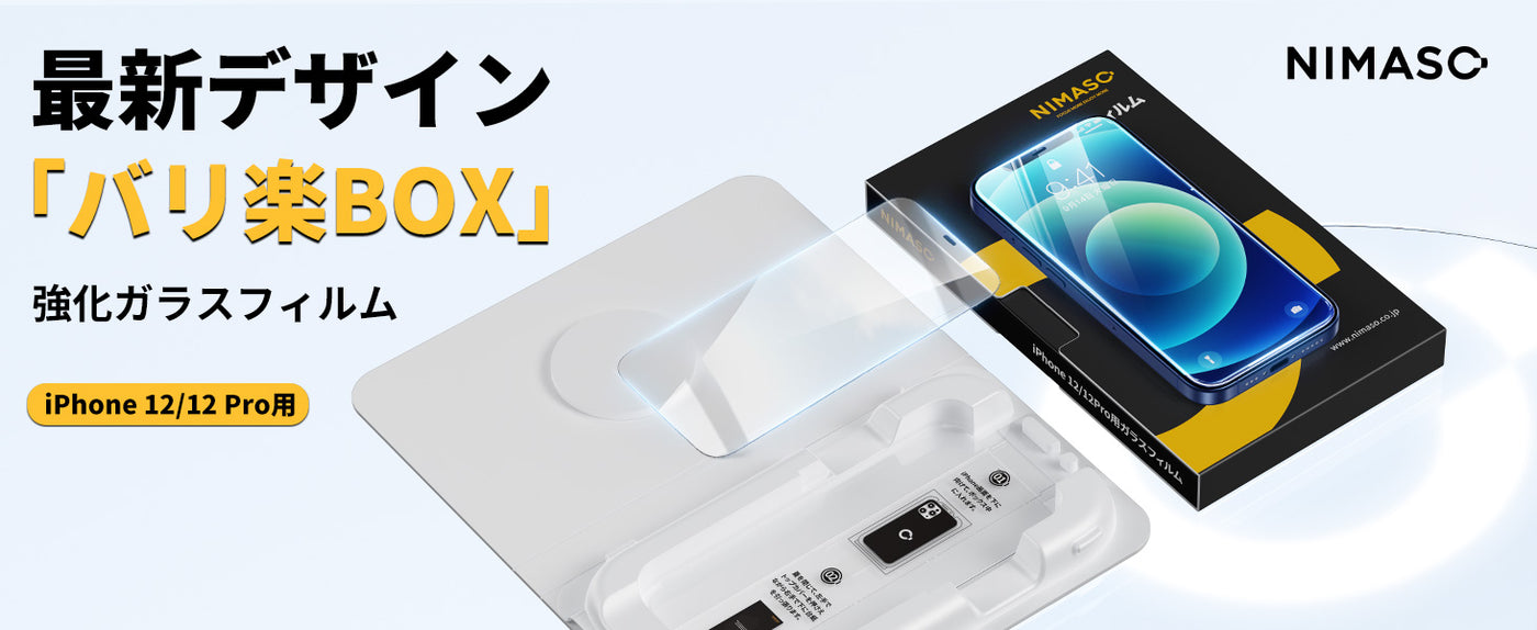 - 【たったの2ステップ・一瞬でズレがなく貼れる】NIMASO最新デザインのバリ楽Boxは、他の補助工具を必要とせず、簡単に貼り付けができます。バリ楽Boxには正確な位置決め装置が搭載されており、iPhone12/iPhone12Proの画面にぴったり合うようにフィルムが配置されています。これにより、画面を下に向けて、ボックス中に入れて引っ張るだけで、誰でも位置ズレなく貼り付けが可能です。