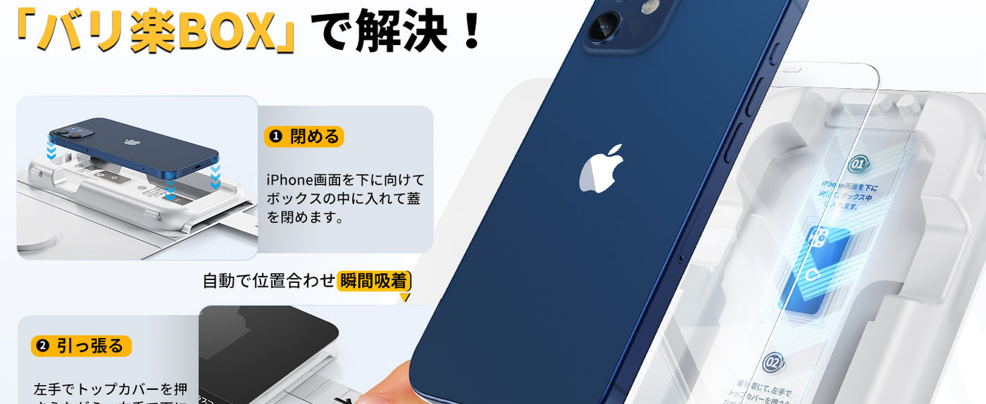 - 【自動除塵・気泡ゼロ】バリ楽Boxは、ホコリを自動で除塵し、粘着面保護シールを剥がした際の静電気を抑えます。また、粘着面は自然と吸着する構造になっています。自分で貼ると、歪みや気泡、ホコリ、浮きなどの問題が起こりやすい、という常識を打ち破り、素人でも完璧に貼り付けできます。