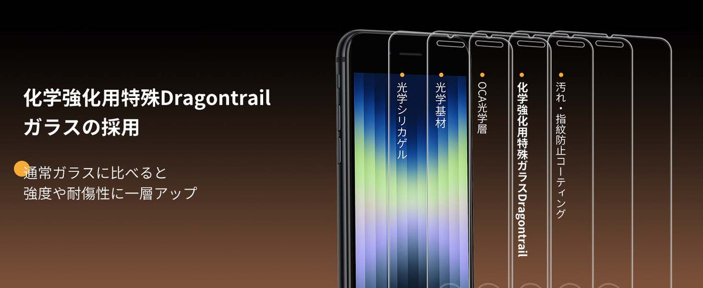 • 【割れにくい強化素材】通常ガラスにより、強度、耐傷性、質感のすべてにおいてもっと優れた性質を持ち、新世代のモバイル機器に最適な革新的な化学強化用特殊Dragontrailガラスを採用、持ち歩き時の落下や、ポケットや鞄の中での圧迫など、外部からの衝撃や擦れからiPhoneをしっかり保護します。
