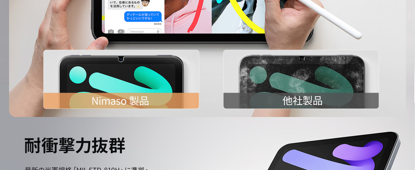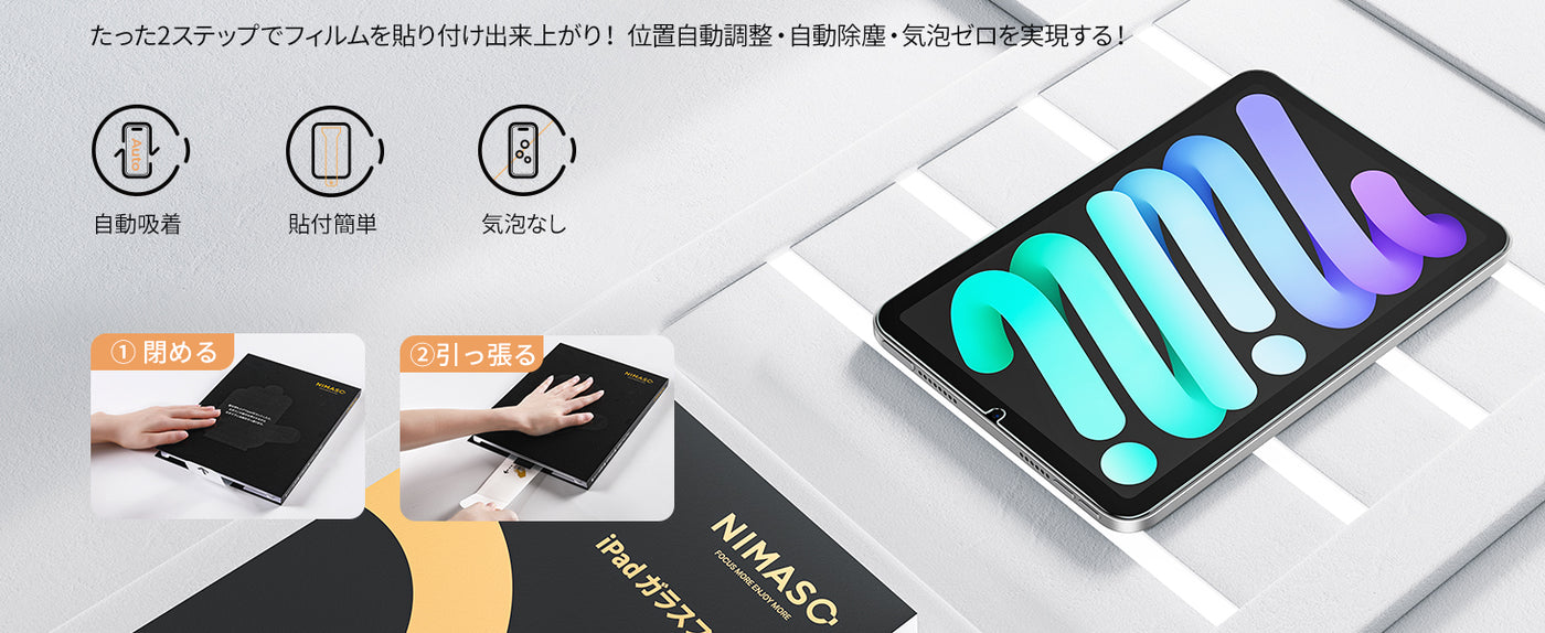 - 【誰でも簡単に貼れる】NIMASO最新デザインの自動除塵セットは、他の補助工具を必要とせず、引っ張るだけで貼り付けが完了します。自動除塵セットには正確な位置決め装置が搭載されており、iPad mini6/mini(A17 Pro)の画面にぴったり合うようにフィルムが配置されています。これにより、貼り付け時に自動的に位置調整が可能になり、効率的で精度のよい貼り付けが可能になりました。フィルムを貼るのが苦手な方でも簡単にフィルムが貼ることができます、「誰でも簡単に貼れる」を実現します。
