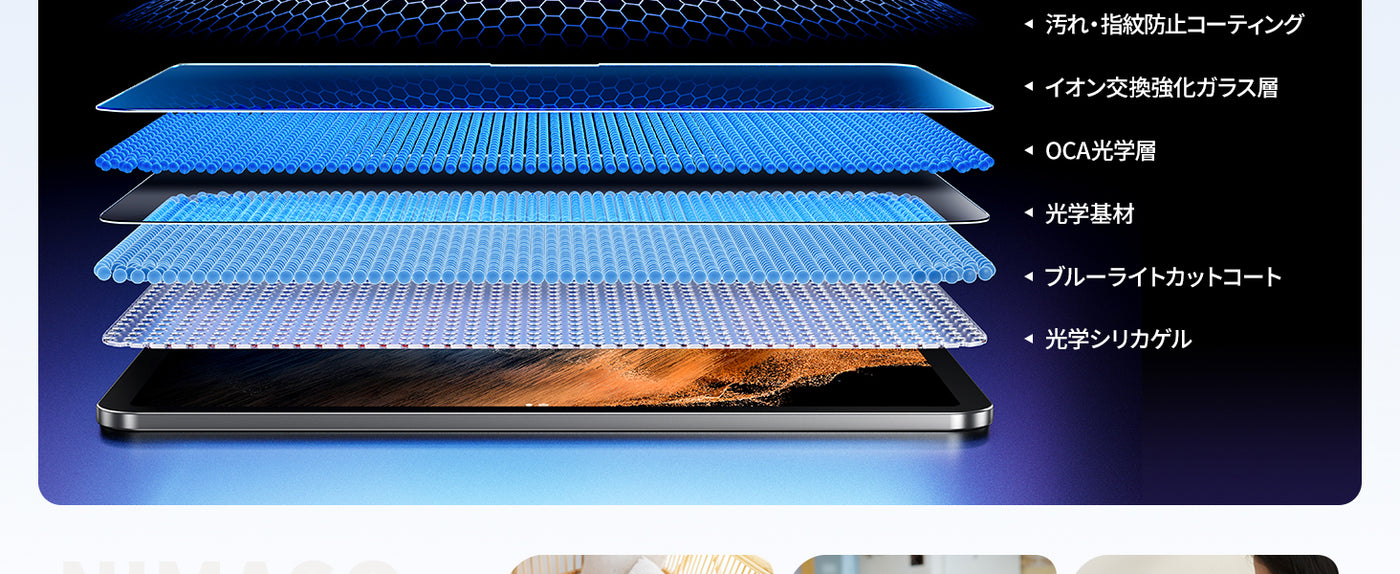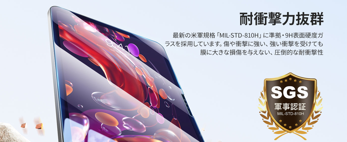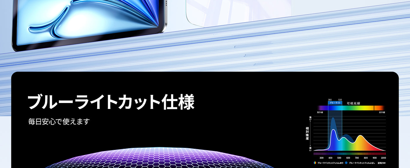 特徴 : ブルーライトカット、指紋防止、撥水撥油、耐衝撃、ケースと干渉せず