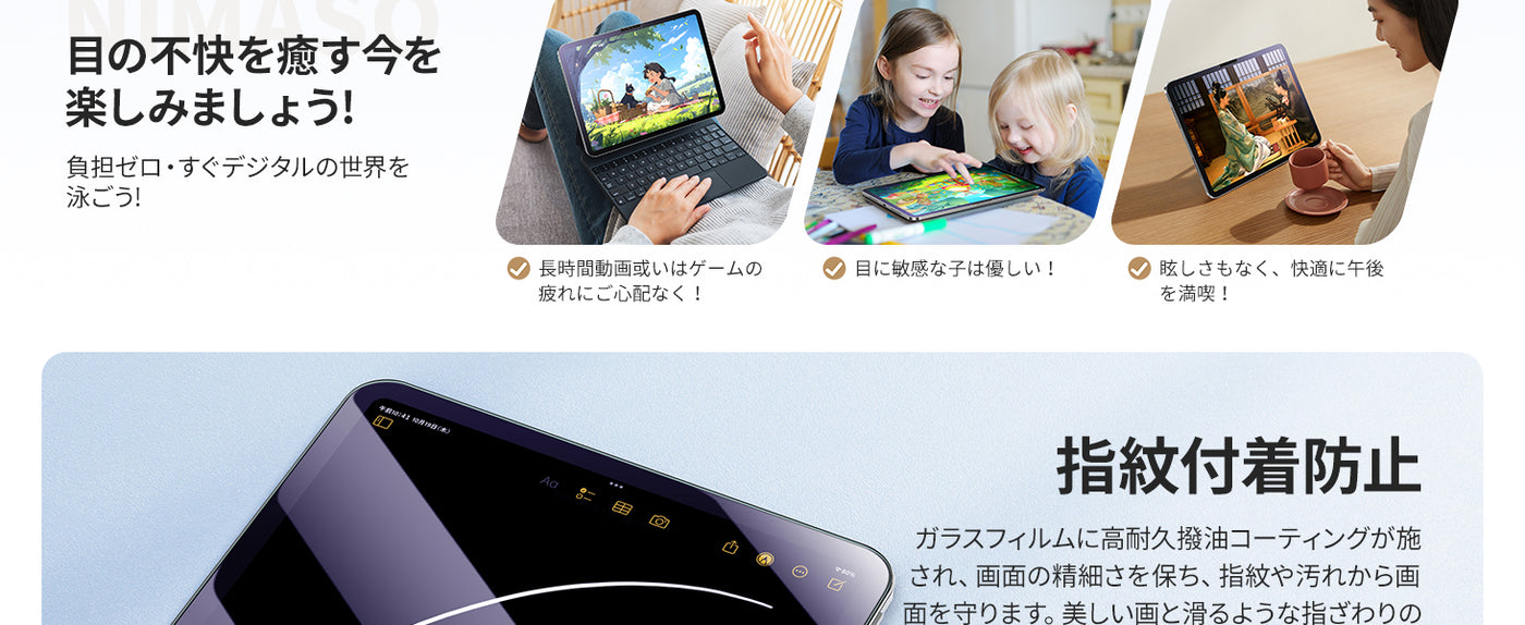 • 【ブルーライトカット機能】iPad Airは高輝度、高コントラストのスクリーンに長時間見ていると、目の疲れにつながり、乾燥、ひりひりするなどの不快な症状が現れることがあります。NIMASOの先進ブルーライトカット反射技術によりブルーライトを大幅にカットでき、目に掛かる負担を軽減しましょう。ディスプレイを長時間ご覧になる方におススメです。