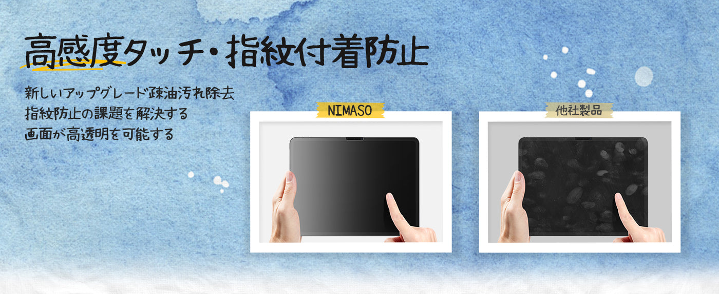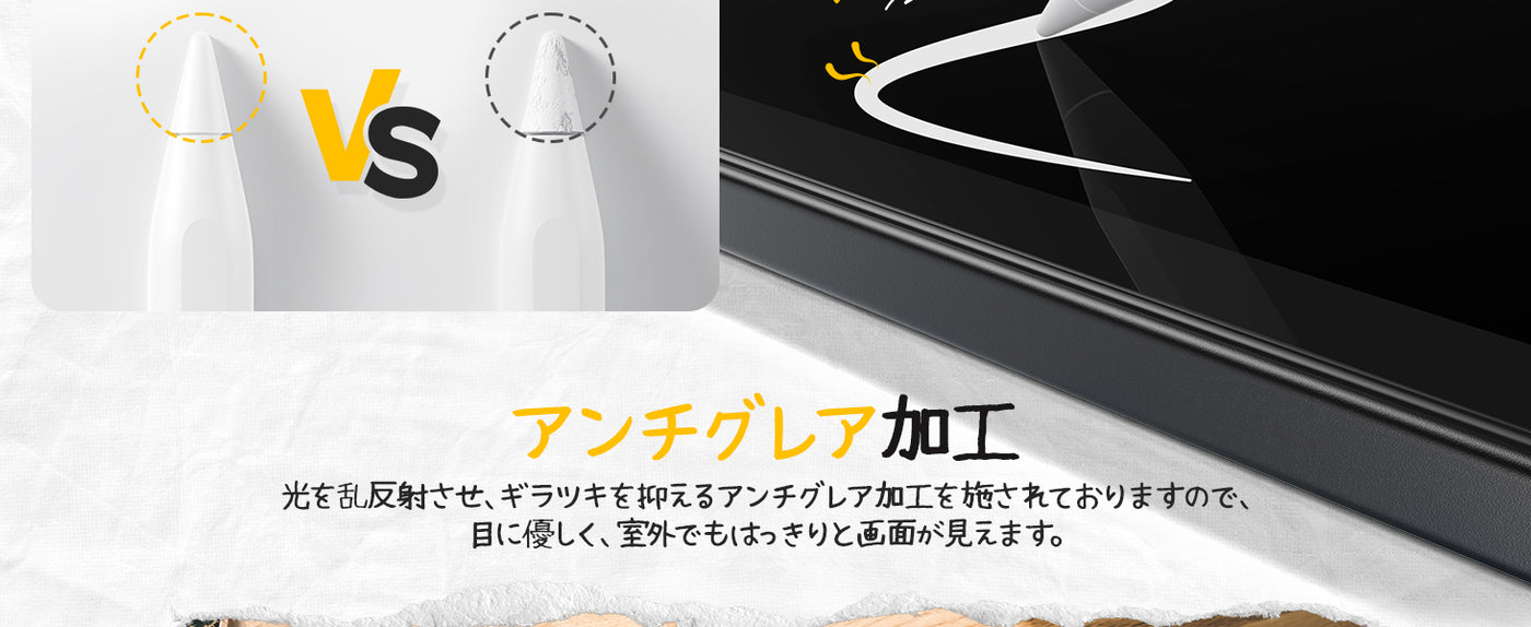 • 【ペン先の摩耗低減・高感度タッチ】紙の描き心地を再現しながらも、ペン先の摩耗や破損は最小限に抑えられるように摩擦を最適化しています。Apple Pencilをより長期間使用することができます。マットな質感と超薄型(0.10㎜)により、指紋防止とスクラッチ防止効果でディスプレイを快適に保ち、指を使ったタッチ操作も違和感なく快適に行えるのが魅力です。