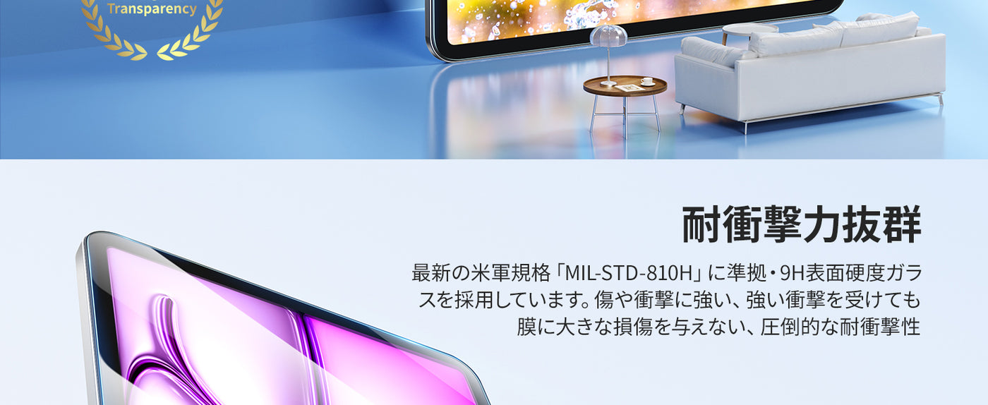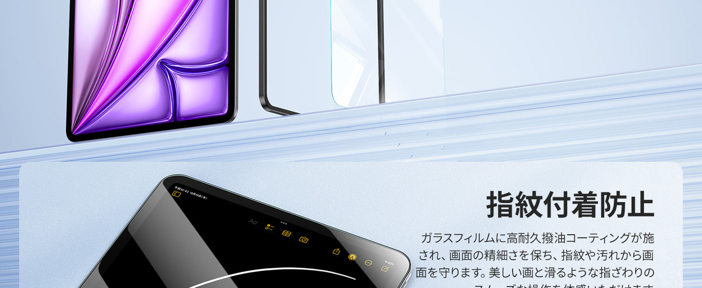 - 【高透過率】厚さ0.33mmの超薄型で、透過率は99.99%。驚くほど高い透明度を誇っており、画面の鮮明さや美しさを損なわずにiPad Air 13(2024)本来の美しい画面をお楽しみいただけます。画面上の操作も違和感なくスムーズに行えます。