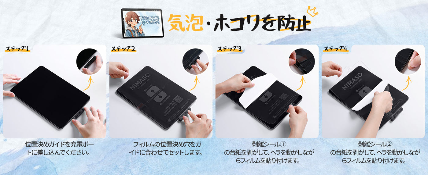 専用位置決めガイド付きで、iPad Pro 11インチ ペーパーライクフィルム 貼り付け簡単。