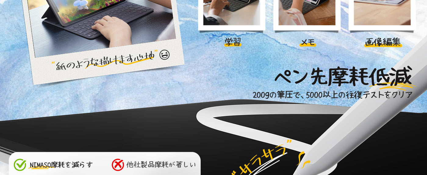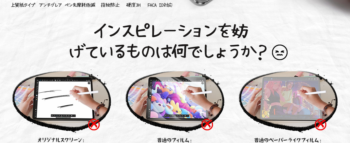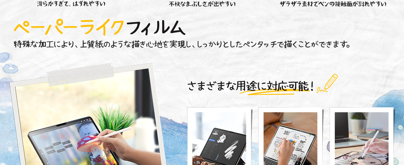 • 【ペン先の摩耗低減・高感度タッチ】紙の描き心地を再現しながらも、ペン先の摩耗や破損は最小限に抑えられるように摩擦を最適化しています。Apple Pencilをより長期間使用することができます。マットな質感と超薄型(0.10㎜)により、指紋防止とスクラッチ防止効果でディスプレイを快適に保ち、指を使ったタッチ操作も違和感なく快適に行えるのが魅力です。