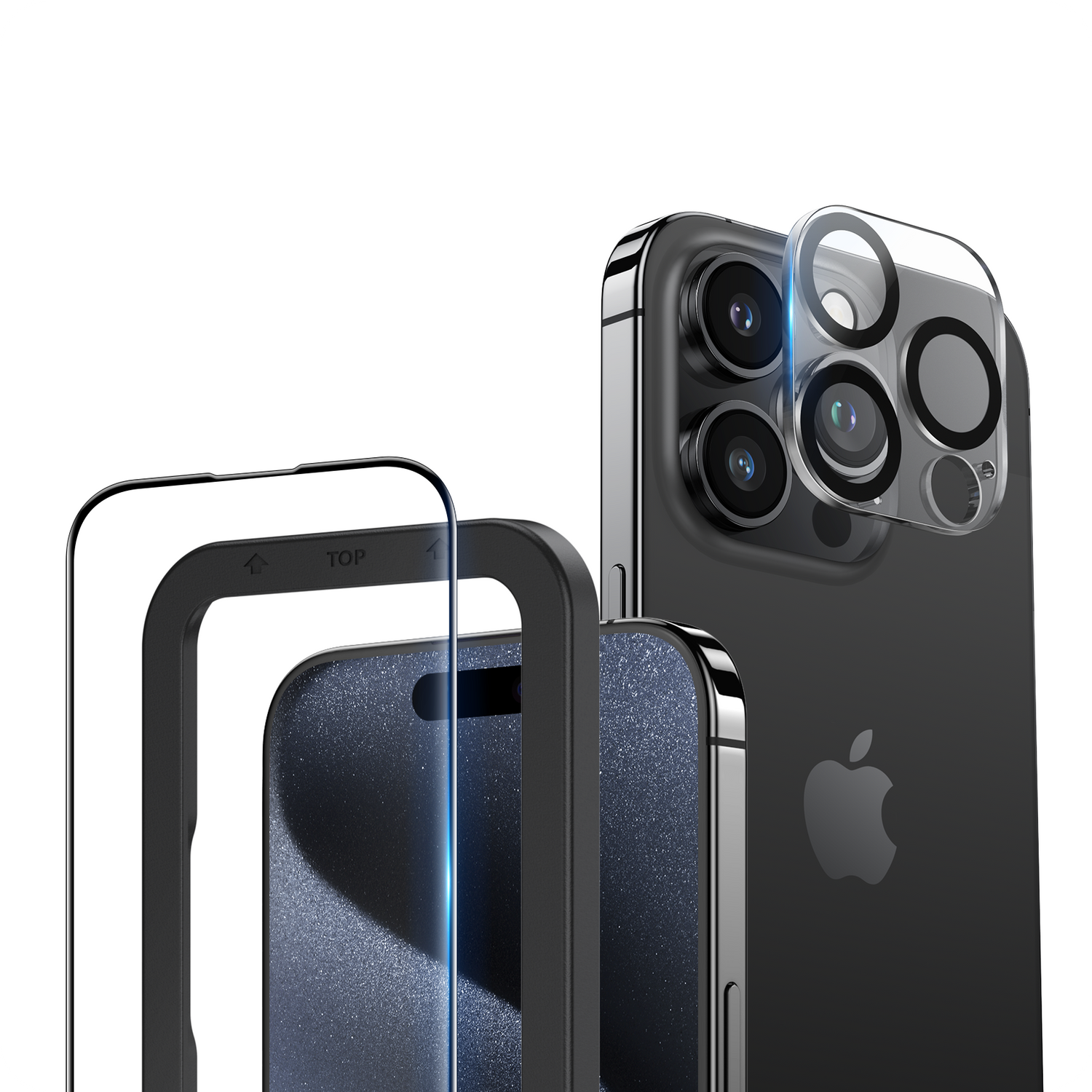 NIMASO iPhone 15/Plus/Pro/Pro Max用 ガラスフィルム + カメラフィルム (2枚/1枚セット) ガイド枠付き 黒縁あり 全面保護