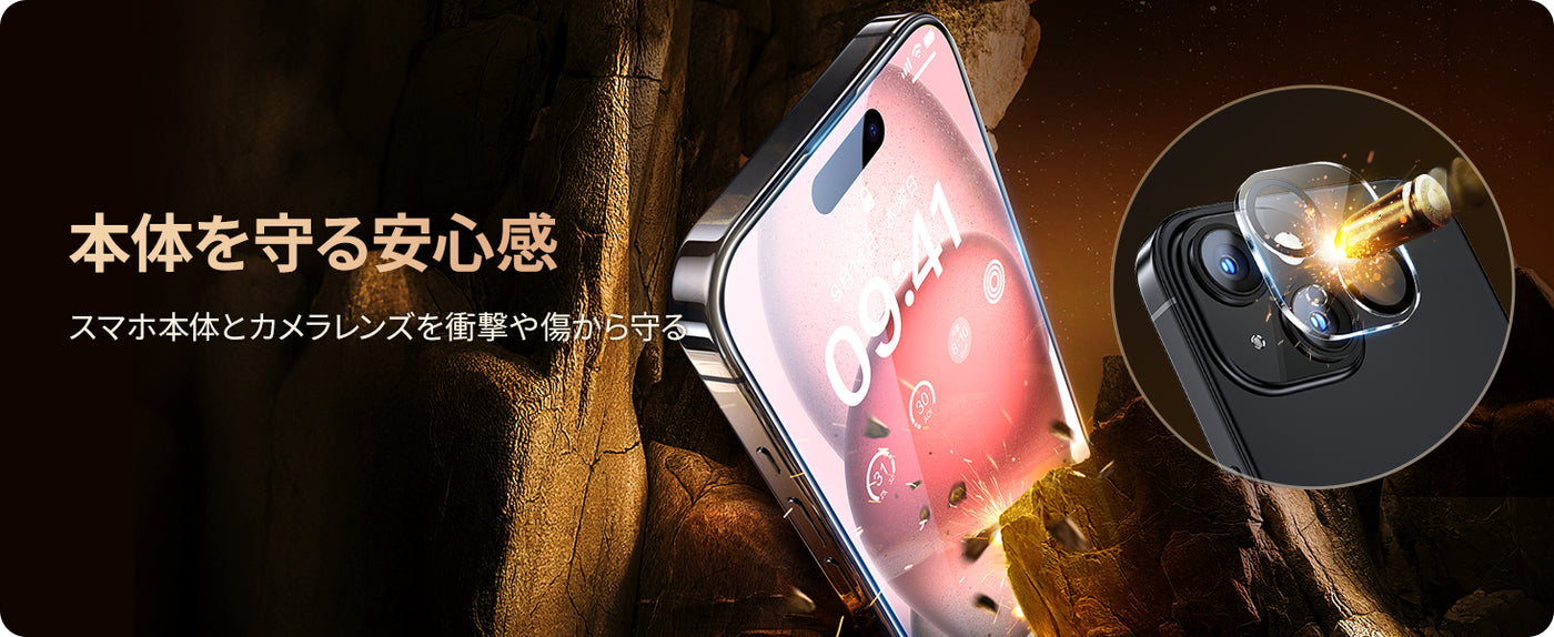 強化ガラス素材、全面保護、9H 表面硬度 、擦り傷防止、衝撃吸収、 撮影影響なし 、一体感抜群 、貼り付け簡単