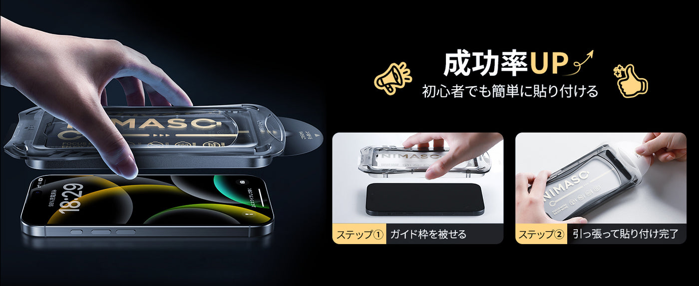 NIMASO最新の 自動除塵ガイド枠付き設計 により、初心者でもわずか 2ステップで気泡ゼロの貼り付け が可能。静電気の力でホコリを除去しながら自然吸着するため、ズレにくい iphone 16 フィルム 貼り 付け サービス として失敗を大幅に減らします。