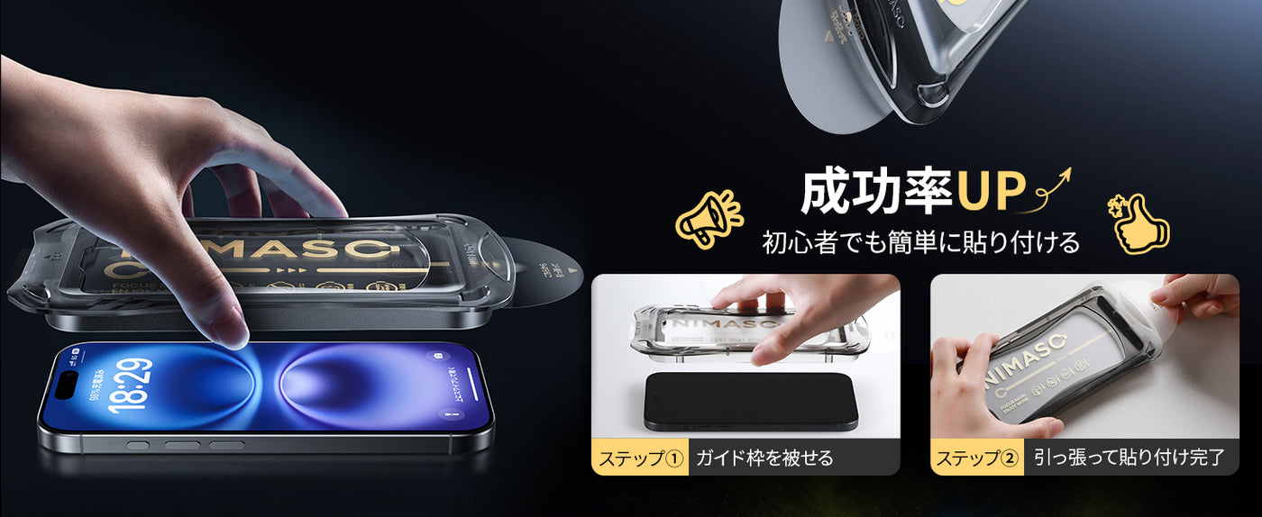 - 【2ステップOK・自動除塵】NIMASO新型の自動除塵ガイド枠が登場!!!被せる、引っ張る、たった2ステップで初心者でも簡単に貼り付けます。フィルムも自然と吸着する構造になっているため、静電気を利用してスクリーン上のホコリが引き出せ、気泡が入りにくく、完璧な貼り付けが実現でき、貼付け時の失敗が大幅に軽減できます。
