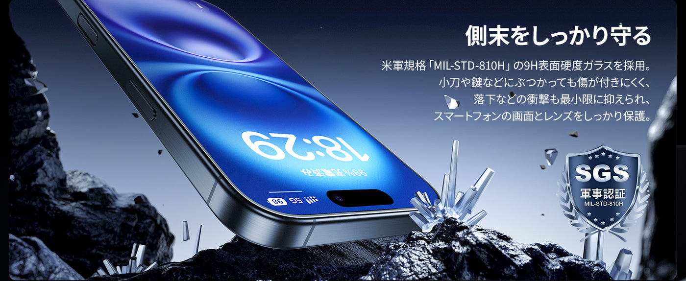 - 【9H硬度・飛散防止】米軍規格「MIL-STD-810H」に準拠(認証番号:SZXEC23002005001)。9H硬度のガラスを採用。小刀や鍵などの鋭いものにぶつかっても傷が付きにくく、iPhone16をしっかり保護します。飛散防止加工により、万一割れてもガラス破片が飛び散ることなく安心です。