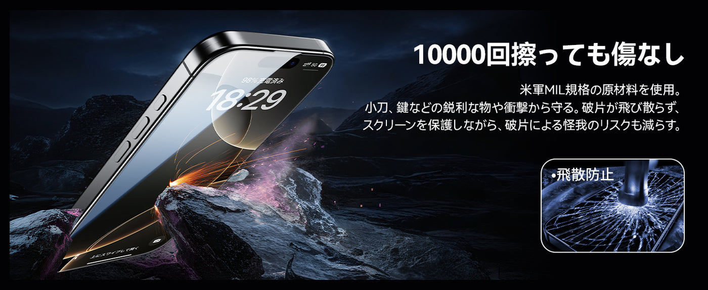 • 【米軍規格・傷や衝撃に強い】米軍規格「MIL-STD-810H」に準拠(認証番号:SZXEC23002005001)。9H表面硬度ガラスを採用しています。スマートフォンがカバンの中で、鍵などの鋭いものにぶつかっても傷が付きにくく、アイフォン16の画面をしっかり保護します。飛散防止加工により、万一割れてもガラス破片が飛び散ることなく安心です。