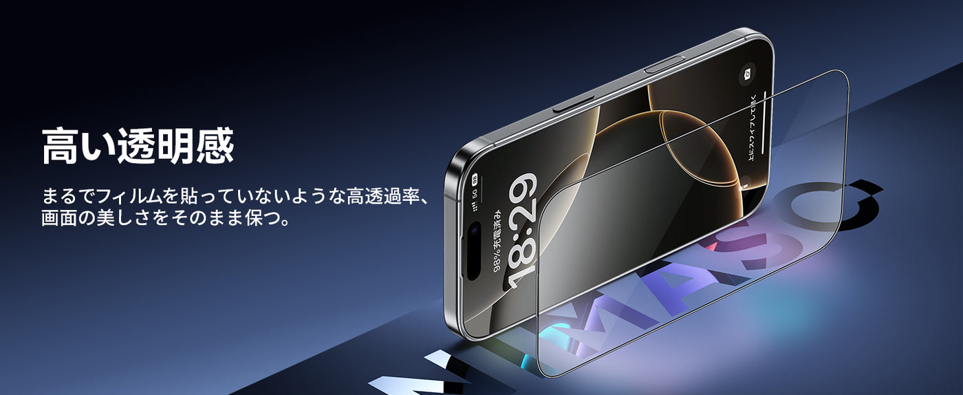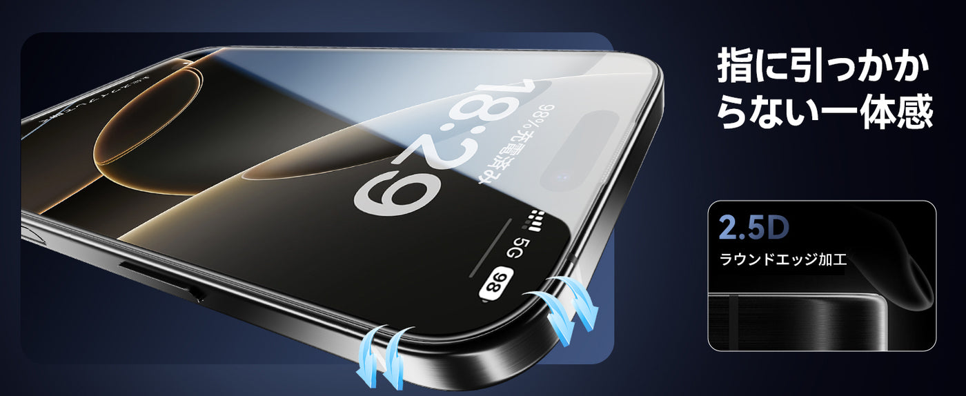 • 「超透過率・ケースと干渉せず」厚さ0.25mmの超薄型で、透過率は99.99%。驚くほど高い透明度を誇っており、画面の鮮明さや美しさを損なわずにいPhone16本来の美しい画面をお楽しみいただけます。2.5Dラウンドエッジ加工が施されており頑丈でありながら、装着後もiPhone16のデザインを損なわず、ケースとの相性も抜群です。