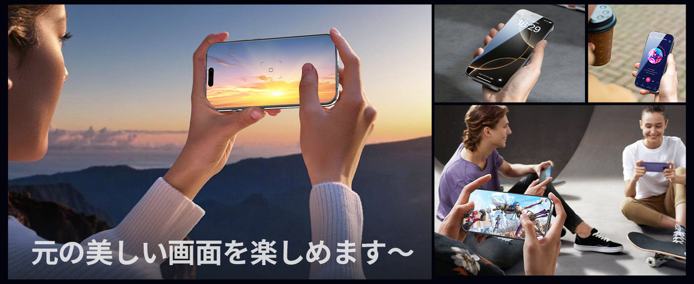 ホコリ防止|全面保護|指紋・汚れ防止|気泡防止|硬度9h|耐衝撃|飛散防止|高透過率|黒縁取り