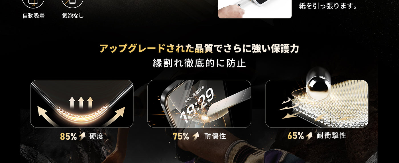 • 【自動除塵・気泡ゼロ】バリ楽Boxは、粘着面保護シールを剥がした際の静電気でホコリを自動的に除塵だけではなく、粘着面が自然と吸着する構造になっています。自分で貼り付けると歪みや気泡、ホコリ、浮きなどの問題が起こりやすい、という常識を打ち破り、不慣れな方、不器用な人でも完璧に貼り付けできます。
