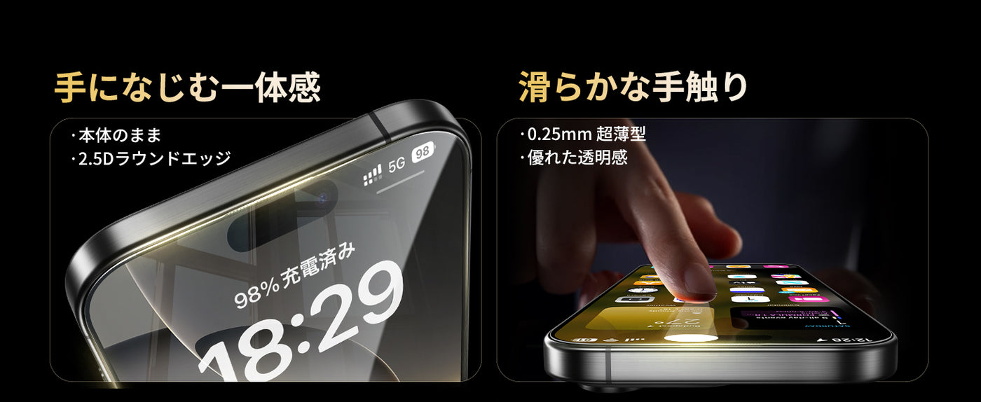• 【99%の透明感・指紋防止】このiPhone16用フィルムは99%という高い透過率を持つ極薄ガラス材料で、画面の精細さを保ちながら、滑るようなスムーズなタッチ操作を体感できます。また、撥水撥油のAF(Anti-Fingerprint)コーディング加工により、指紋がつきにくく、汚れや油分をはじき、着いても拭き取るだけで綺麗になります。