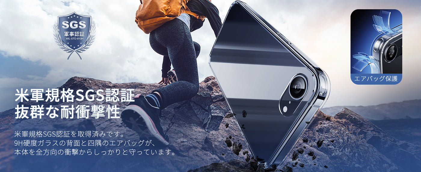 - 【米軍規格SGS認証・超強耐衝撃性】世界で有名な米国防総省が規定する米軍採用品規格「MIL-STD-810H」認証を取得済みです(認証番号:GZMR220802496901-1)。ガラス背面は、9Hの硬度を持ち、鍵など鋭利な物と擦れても傷付きにくく、衝撃からiPhone16eを守ります。さらに、側面にはドイツ製の耐衝撃素材TPUを採用し、四隅にはエアバッグを付けて、本体が落下しても衝撃を和らげしっかり守ります。