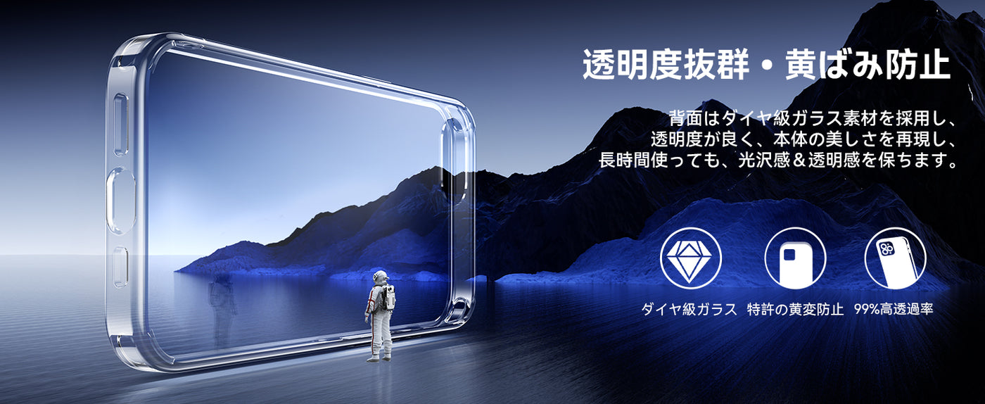 - 【2024最新改良・黄変防止強化】本製品の背面素材はガラスで、その特性により黄ばみが起こりません。さらに、AF防指紋コーティングを施しているため、指紋や汚れがつきにくく、サッと拭くだけで簡単にきれいになります。ケースを使いやすく、清潔に保つことができます。また側面には、ドイツ製バイエルTPU素材を採用し、TPUポリマーにUV剤を添加して黄変防止性能を高めています。長時間使用しても、光沢と透明感を維持します。