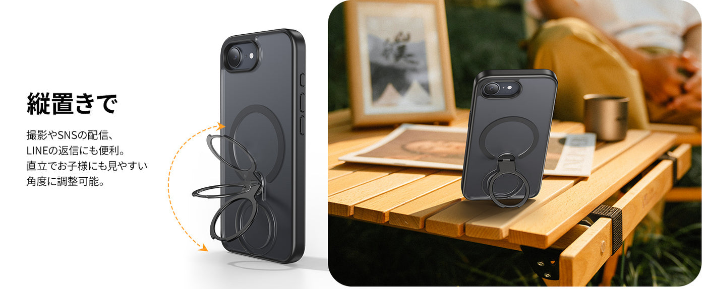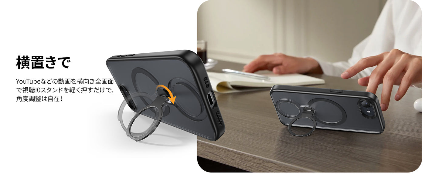 • 【360°回転スタンド · 向きも角度も自由自在】多機能スタンドとリング一体型の斬新なデザインです。スタンドを閉じれば背面はスマートに。どの向きでも安定して支えることができ、横置きの場合は30-113°、縦置きの場合は24-97°に角度調整が可能。スタンドを開くだけで好きな角度でスマホを楽しめます。スタンド部分を指にかければスマホリングとしても使えます。※リング部分を持ったまま強い力を与えないようにご注意ください。