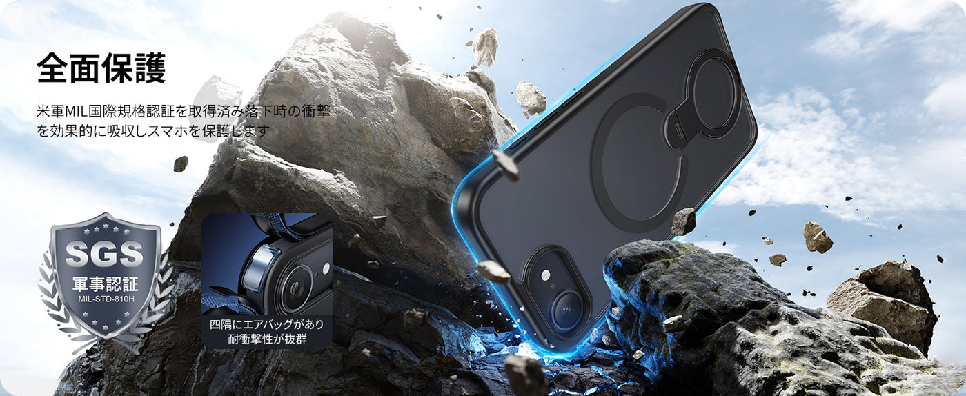 • 【米軍規格SGS認証・超強耐衝撃性】世界で有名な米国防総省が規定する米軍採用品規格「MIL-STD-810H」認証を取得済みです(認証番号:GZMR220902856301)。コンクリートの地面に厚さ5mmの合板を敷き、高さ1.2mから合計26回、違う角度から落下させる実験をしましたが、本体に傷はつきませんでした。四隅には高耐震クッションを搭載しており、高い耐衝撃性です。スマホを全方位からしっかりと守ります。