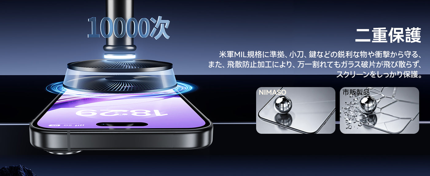 - 【米軍規格・傷や衝撃に強い】米軍規格【MIL-STD-810H】に準拠(認証番号:SZXEC23002005001)。9H表面硬度ガラスを採用しています。スマートフォンがカバンの中で、鍵などの鋭いものにぶつかっても傷が付きにくく、画面をしっかり保護します。飛散防止加工により、万一割れてもガラス破片が飛び散ることなく安心です。