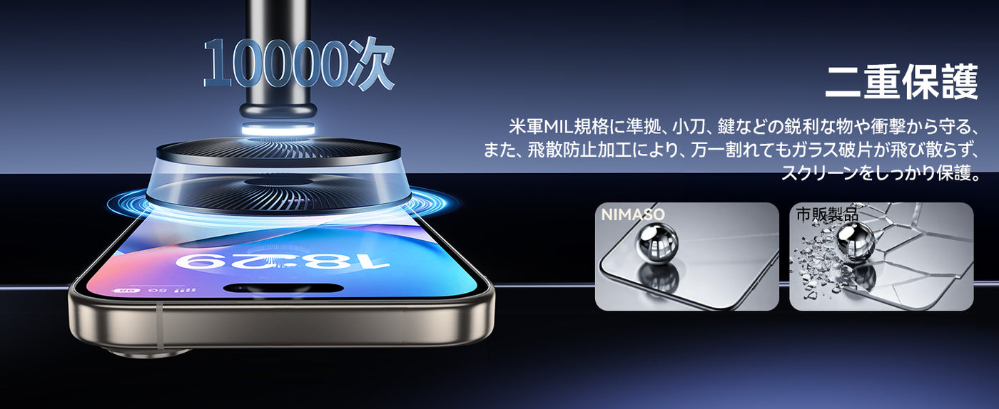 - 【米軍規格・傷や衝撃に強い】米軍規格【MIL-STD-810H】に準拠(認証番号:SZXEC23002005001)。9H表面硬度ガラスを採用しています。スマートフォンがカバンの中で、鍵などの鋭いものにぶつかっても傷が付きにくく、画面をしっかり保護します。飛散防止加工により、万一割れてもガラス破片が飛び散ることなく安心です。