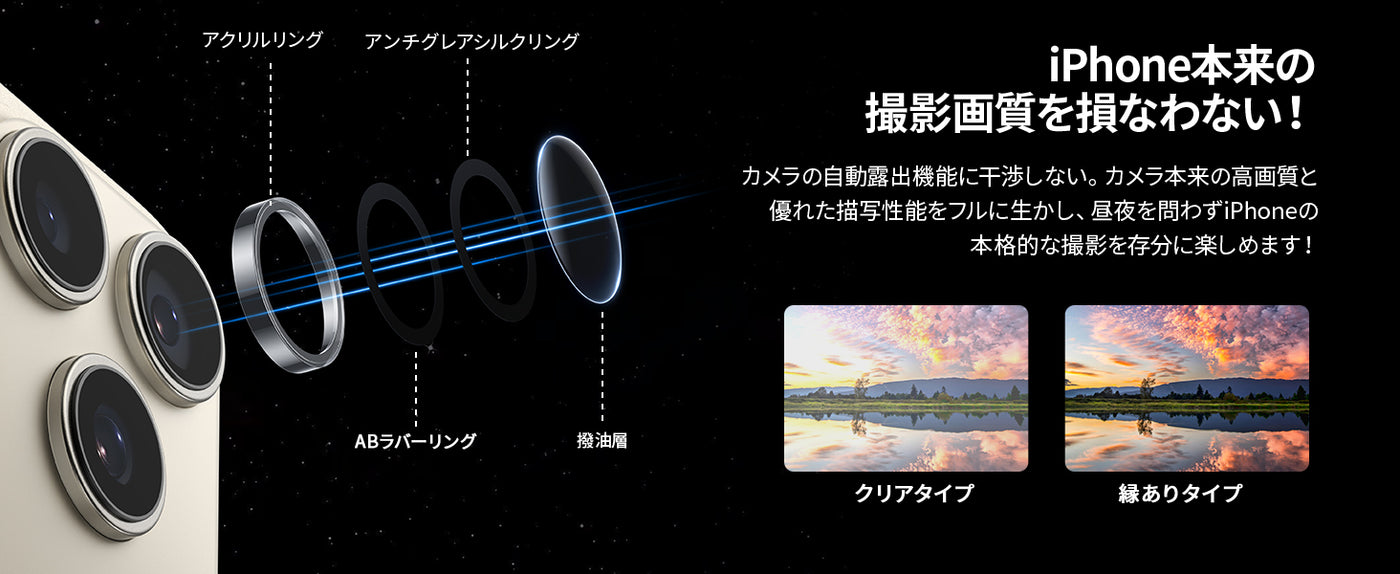 - 【高透過・露出オーバー防止】透過率は99%以上なので、あいふぉん17プロの液晶画面を守りながらスクリーン本来の美しい画質も損なうことなく、オリジナル画面の色をより鮮明に表現できます。また、レンズフィルムは黒縁仕上げでカメラの自動露出機能に干渉せず、明るい被写体でも暗い被写体でも適正な明るさで写真を撮ることができます。