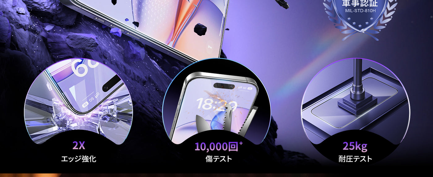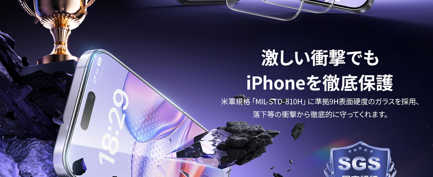 - 【黒縁全面保護・耐衝撃性アップ】黒縁取りでスマートフォンの画面をフルカバーして、落下や衝撃による損傷からスマートフォンを守ります。米軍規格【MIL-STD-810H】に準拠(認証番号:)・9H表面硬度ガラスを採用し、スマートフォンがカバンの中で、鍵などの鋭いものにぶつかっても傷が付きにくく、アイフォンの画面をしっかり保護します!また、飛散防止加工により、万一割れてもガラス破片が飛び散ることなく安心です。