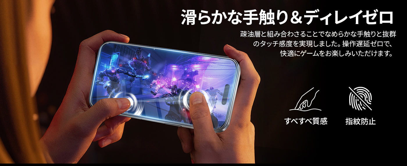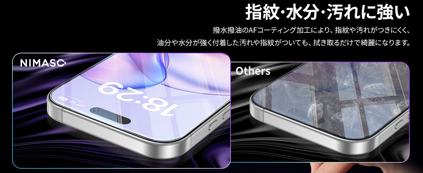 - 【指紋防止・滑らかな触り心地】本製品は撥水撥油のAF(Anti-Fingerprint)コーディング技術により、さらに滑らかな触り心地を実現しています。指紋や汚れがつきにくいので、常に美しい画面をお楽しみいただけます。厚さ0.33mmの超薄型で、99.99%に近い驚くほど高い透明度を誇っており、画面の鮮明さや美しさを損なわず、優れた視覚体験をお楽しみいただけます!