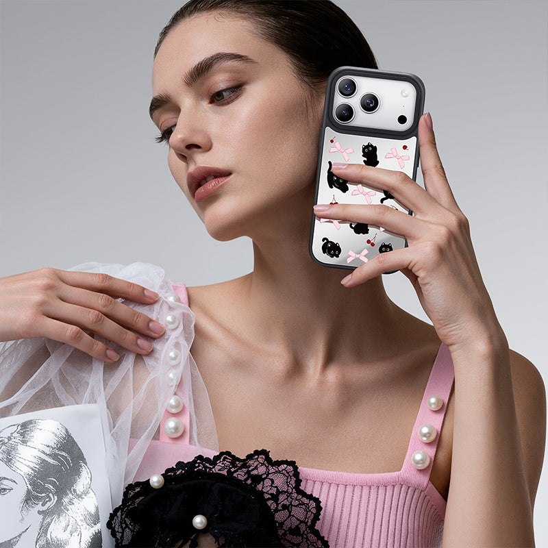 NIMASO iPhone 17/Pro/Pro Max/Air用 ケース MagSafe対応 ミラー かわいい おしゃれ 耐衝撃 ワイヤレス充電対応(ファンシーシリーズ)ブラックキャット