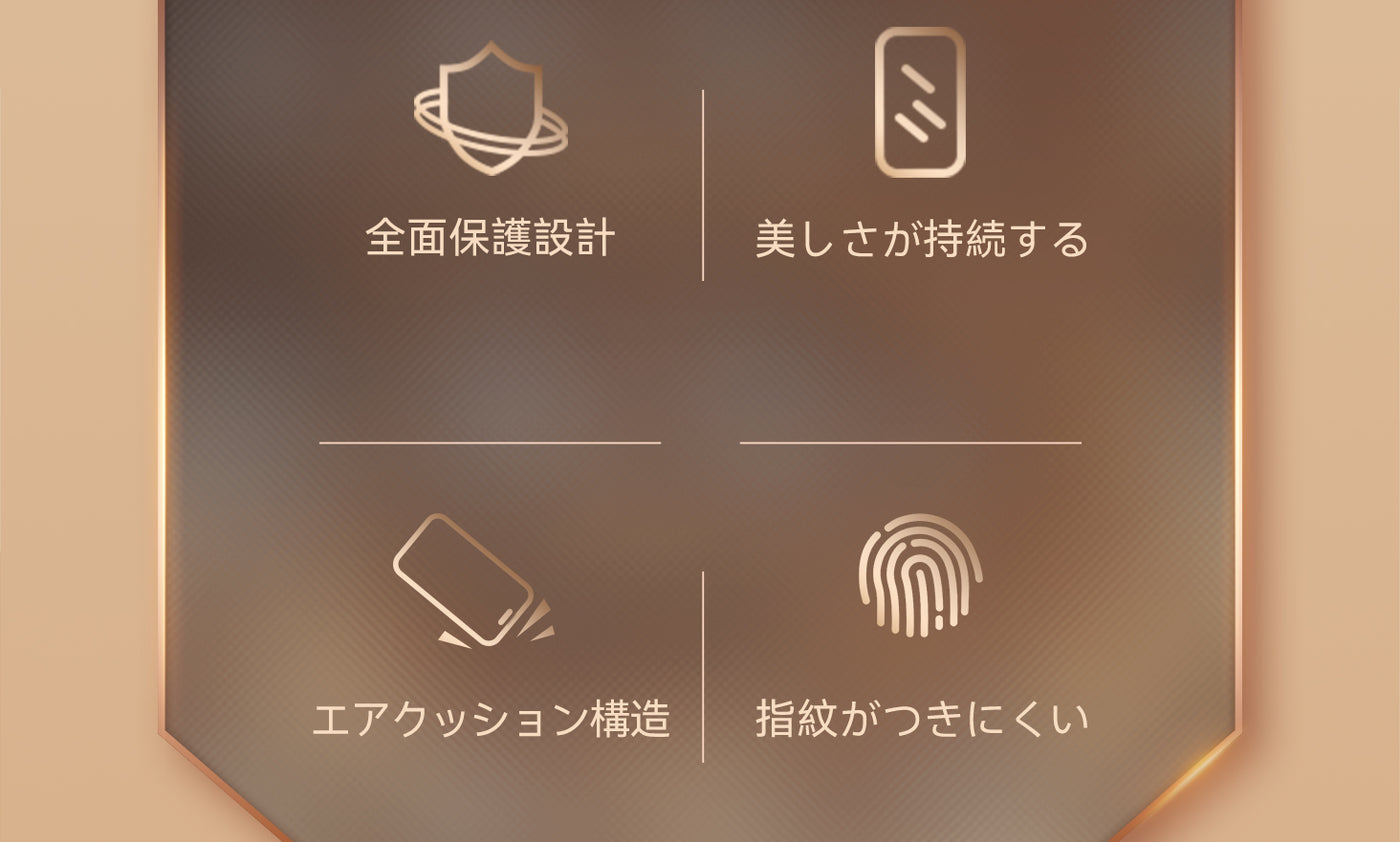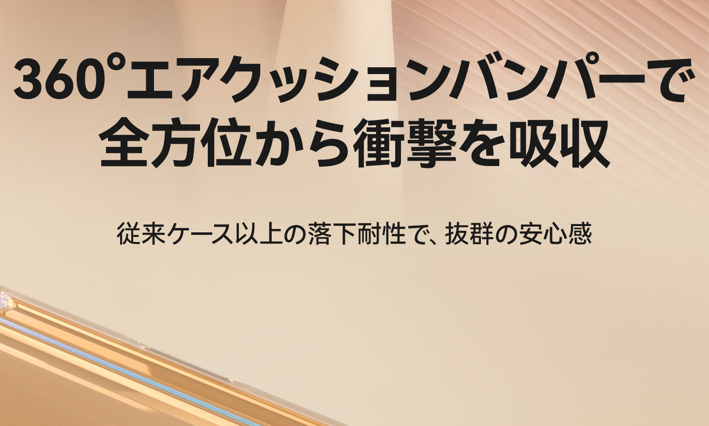 耐衝撃、360°エアクッションバンパー、滑り防止、黄ばみ防止、液晶画面・カメラレンズ保護、指紋防止コーティング