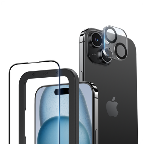 NIMASO iPhone 15/Plus/Pro/Pro Max用 ガラスフィルム + カメラフィルム (2枚/1枚セット) ガイド枠付き 黒縁あり 全面保護